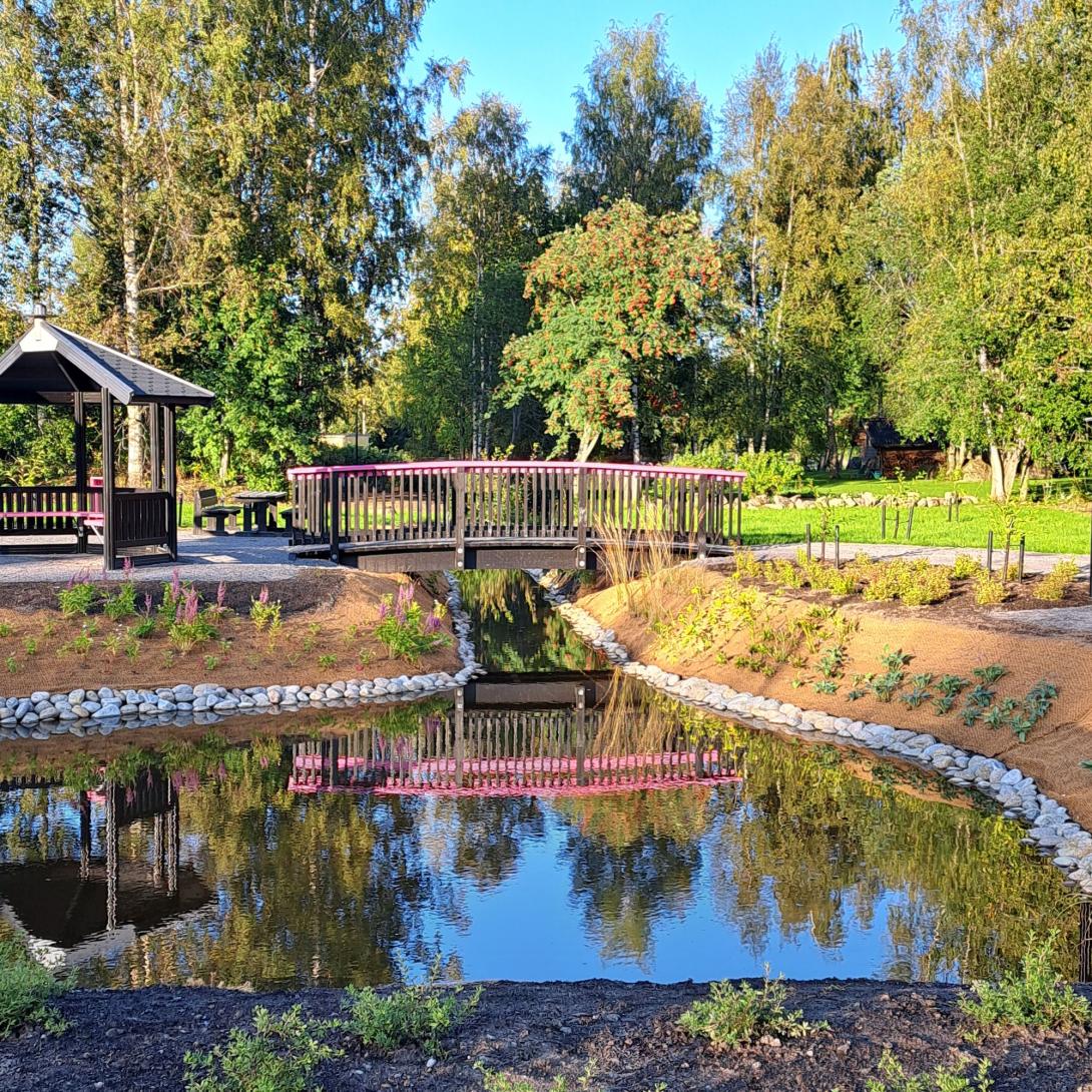 After the playground, the recreational route leads to Körsbärsdalen. Körsbärsdalen is an activity park with a well-equipped outdoor gym for seniors, a boule pitch and benches to rest on under a shady pergola. There is also an interactive arch that invites to dance and play or perhaps you want to play a memory game with the play panels on the ground. In the middle of the park, a lovely pond gathers storm water from the nearby ditches and gives a soothing addition to the beautiful surroundings.